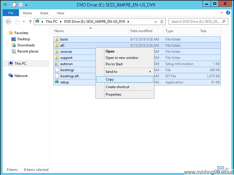 You’ll need a Windows setup ISO, here I’m using Windows Server 2019 evaluation downloaded from Microsoft’s website, after downloaded it you’ll need to extract the content from it, you could use 7-Zip or some other ISO extract tools but here I’m just using Windows to mount it and then copy it out.